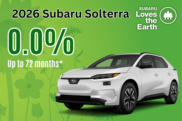 0.0% financing up to 72 months on all 2026 Subaru Solterra models. Monthly payment of $13.89 per $1,000 financed. Subject to credit approval.