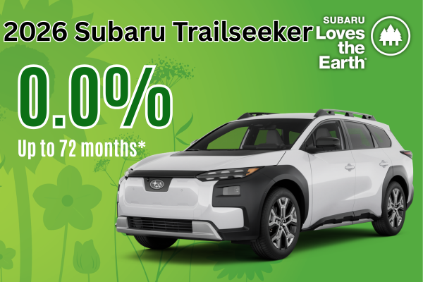 0.0% financing up to 72 months on all 2026 Subaru Trailseeker models. Monthly payment of $13.89 per $1,000 financed. Subject to credit approval.