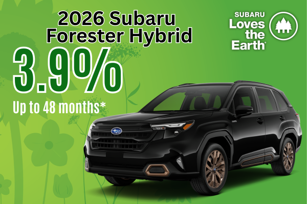 3.9% financing up to 48 months on all Forester Hybrid models. Monthly payment of $22.57 per $1000 financed. Subject to credit approval.